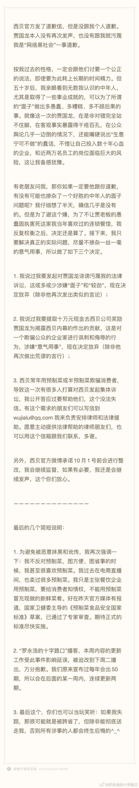 在 9 月 15 日的微博中,罗永浩宣布决定放弃对贾国龙提起的法律诉讼,同时也不再追讨十万元现金奖励西贝内部信息的事宜。