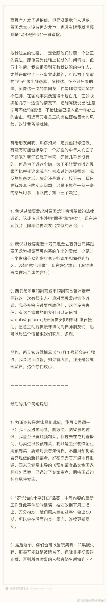9 月 15 日晚,@罗永浩的十字路口再次就与西贝莜面村的争议发表声明。