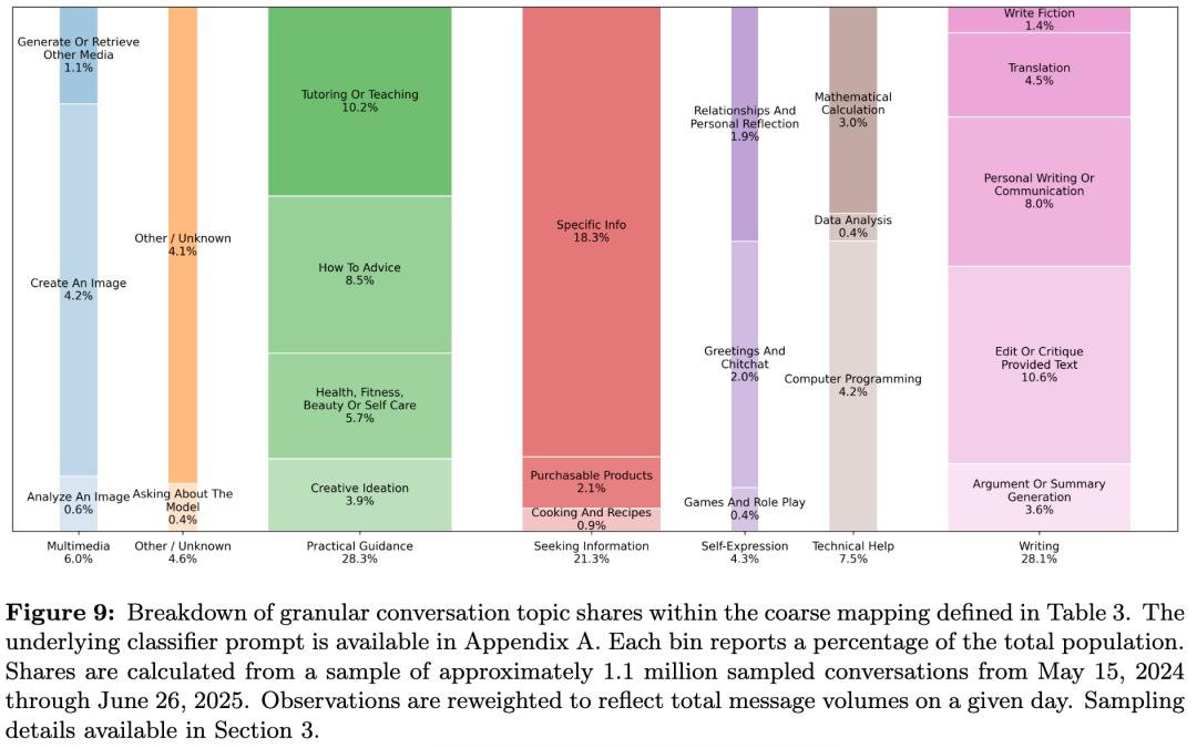 在这些使用中,实用建议、信息查询及文书写作成为最常见的三大主题,合计占对话内容的 80%。
