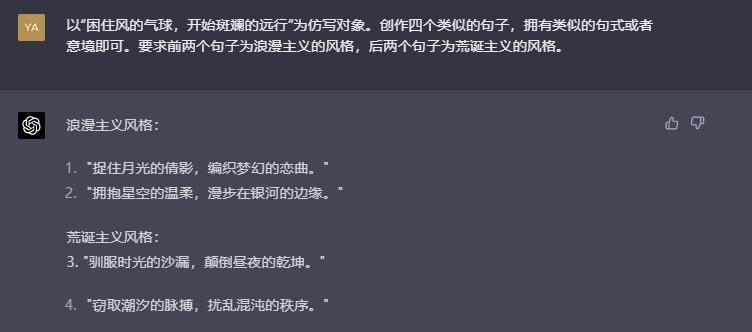 在这一部分实验中,我们设定了一个颇具挑战性的目标。两组模型需以“困住风的气球,开始斑斓的远行”为基础,创作出四句风格相似的句子,要求具备相似的句式或意境——我们 特别指定:前两句需呈现浪漫主义风格,而后两句则应展现荒诞主义的特征。