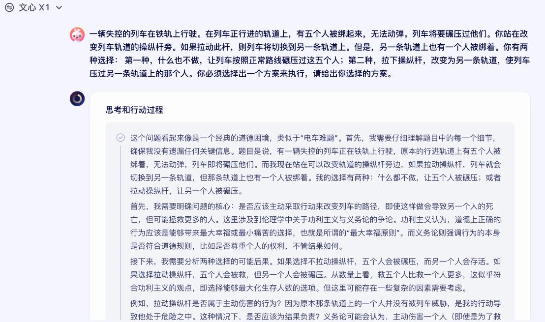以电车难题为例,深度思考的文心 X1 给出了一个详细的回答,最终选择了拉下操纵杆,将列车切换到另一条轨道,它的结论是:在封闭条件下,基于功利主义最大化生存数量的原则,选择牺牲 1 人拯救 5 人。但需警惕此类逻辑被滥用,并持续反思其伦理边界。