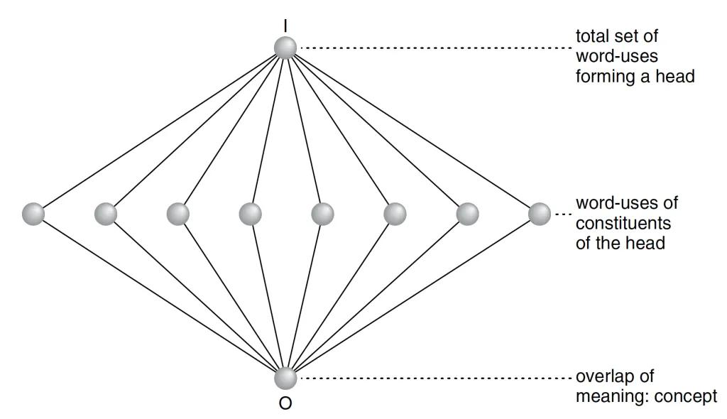 马斯特曼《翻译》(Translation)一文中的“头符”数学建模示意图,呈现了“头符”的“格”(lattice)结构:上层为一个“头符”集合,中层为词的各种具体用法,下层为词义的交集,即共享的意义重心 / 概念。这种可计算的语义结构,便于机器翻译和自动分析。