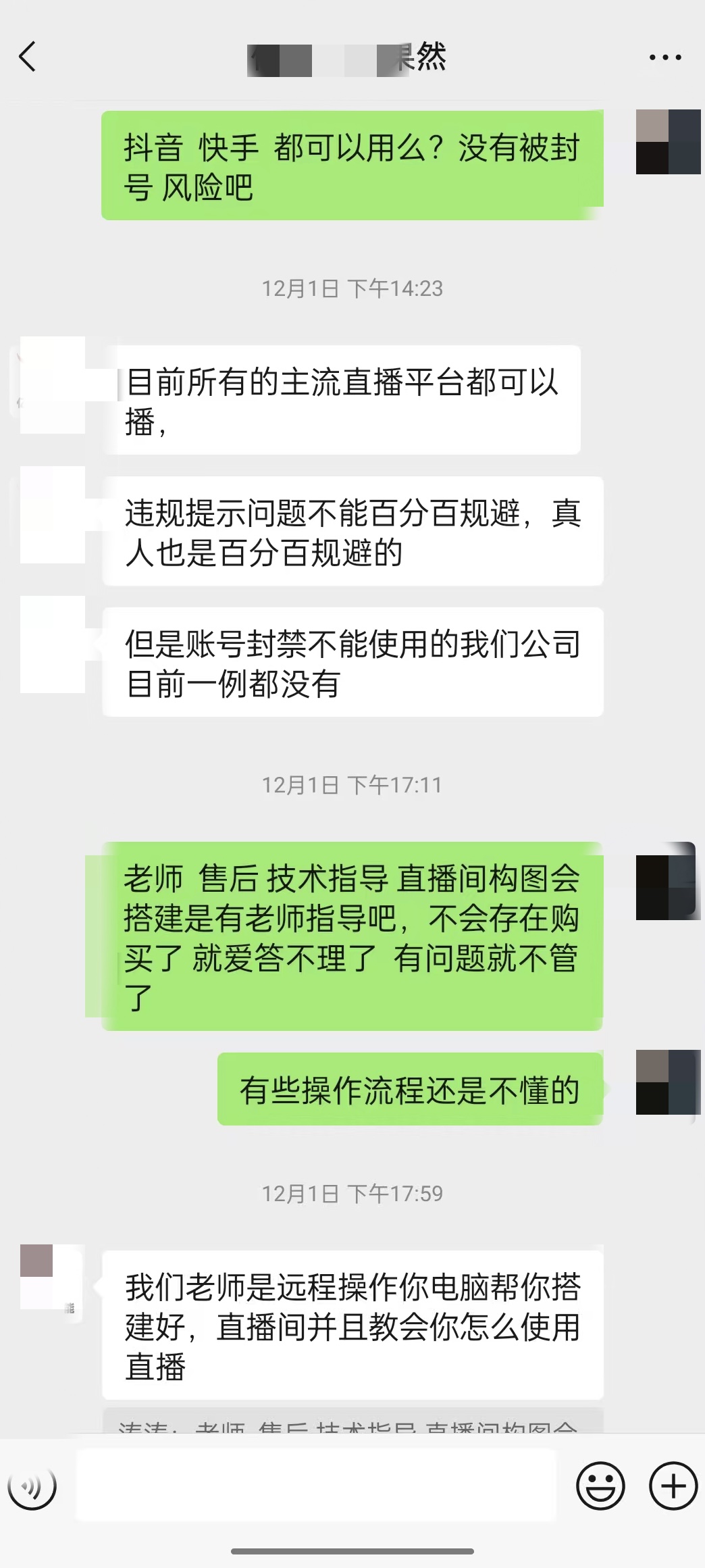 当王顺问到能在哪些平台使用以及是否有封号的风险时,对方回复“目前所有的主流直播平台都可以播,账号封禁、不能使用的,我们公司目前一例都没有。”在没有先试用,也没有查询这家公司资质的情况下,王顺爽快地付了钱。