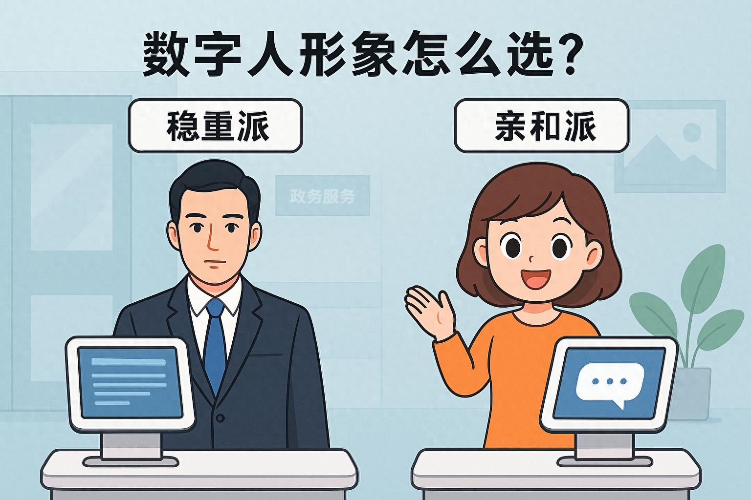 首先来看“稳重类型”。在政务服务、办事大厅以及企业培训或会议等场合,信息的准确性和口径的一致性非常重要,因此选择真人形象更为合适。由于真人形象更显专业和可信,再加上标准的开场白、材料清单和流程指导,整体给人一种正式的感觉,同时也能缓解用户的紧张情绪。银行网点同样属于这一类型,考虑到风险提示和合规性的前置展示,真人形象显得更为稳妥。