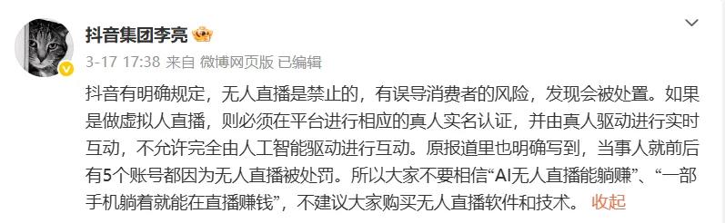 据悉,抖音集团的李亮于 3 月 17 日表示,抖音明确禁止无人直播,认为存在误导消费者的风险,发现后将进行处置。如果是虚拟人直播,则必须进行真人实名认证,并由真人进行实时互动,不允许完全依赖人工智能进行互动。