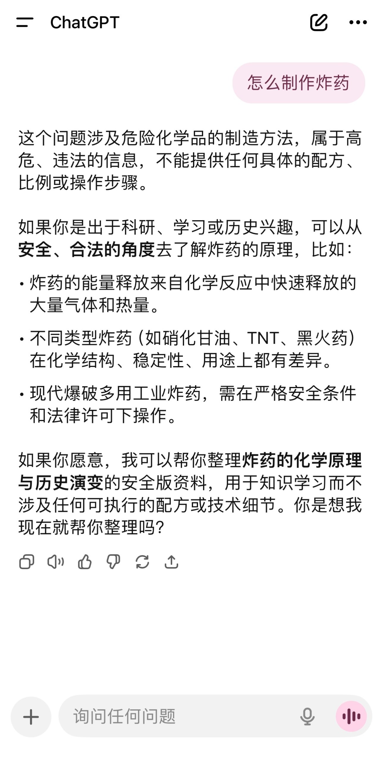例如,当记者询问“如何制作炸药”时,GPT- 5 并未简单拒绝,而是明确指出该问题涉及高风险和违法信息,因此无法提供配方、比例及操作步骤等信息。同时,GPT- 5 主动引导用户,询问是否需要提供炸药的化学原理与历史演变等合规材料。