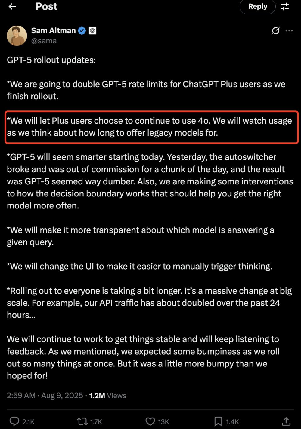 “我们会让 Plus 用户选择继续使用 4o,”Sam 说。“在考虑旧模型提供多久时,我们会观察其使用情况。”