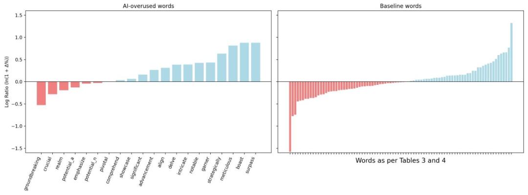 这些变化究竟是因为人们直接模仿 AI 产生的内容,还是 AI 确实在潜移默化中影响了人类的语言习惯,使大家下意识地使用这些词汇呢?