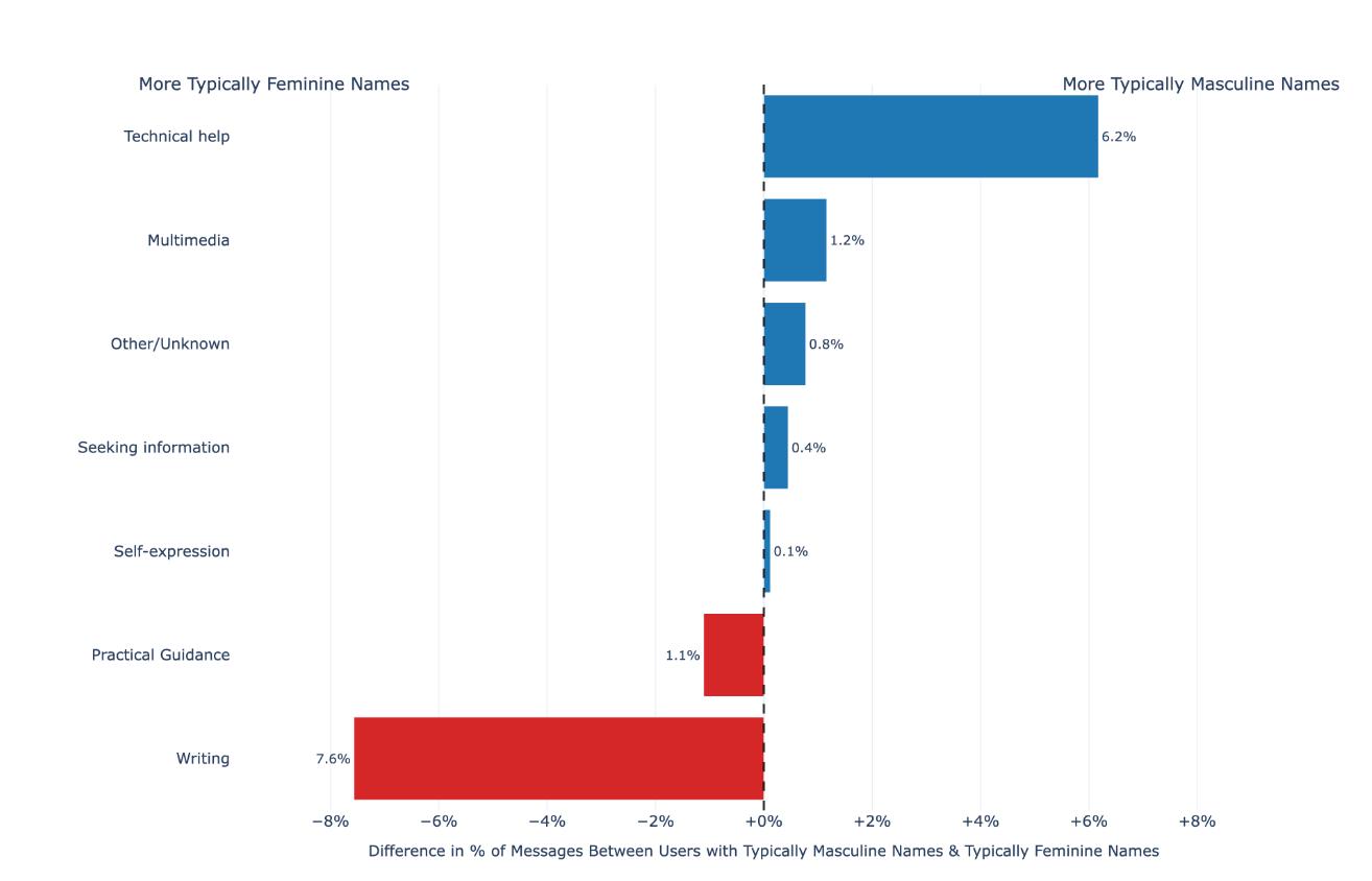研究指出,尽管 ChatGPT 初期的用户主要是男性(约占 80%),但到 2025 年中期,女性用户(52%)的比例已经与男性持平,甚至略有上升,并且在使用需求上表现出明显差异。
