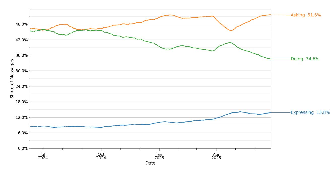 论文将用户动机分为三类:询问(Asking)、执行(Doing)和表达(Expressing)。总体来看,「询问」占比最高(51.6%),其次是「执行」(超过三成),而「表达」占比最少(仅一成)。然而在职场环境中,情况发生了逆转:执行的比例增至 56%,其中写作是最主要的执行形式。