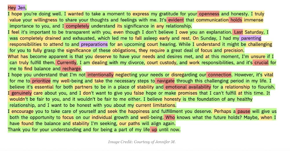 Jessica 便是其中一位受害者。当她的男友发送了一段感人至深的文字时,她感动得泪流满面,哭了一场。但在反复端详这条信息后,她突然意识到有些不对劲:这段文字的文采是不是显得过于优秀了?