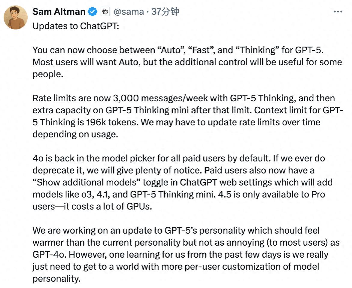 8 月 13 日,OpenAI 的首席执行官山姆·奥尔特曼在社交媒体上发布了有关 ChatGPT 最新功能的更新。他提到,GPT- 5 提供了“自动”、“快速”和“深度思考”三种响应模式 ,并指出大部分用户更适合使用“自动”模式,而这些新选项则为特定需求的用户带来了便利。此外,山姆·奥尔特曼强调,正在开发的 GPT- 5 将展现出更具亲和力的人格特征,避免像 GPT-4o 那样过于热情。“我们团队深知: 未来必须实现 AI 人格的个性化定制。”他补充道。