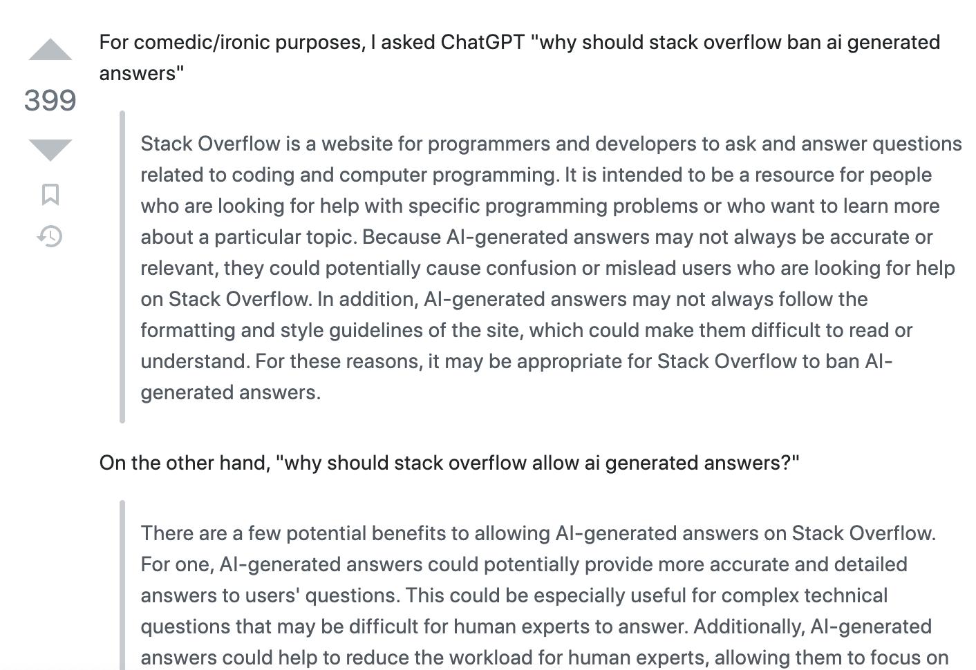 一片叫好声中,也不乏有人泼来冷水——程序员首选问答社区 Stack Overflow 日前便宣布,禁止用户复制 ChatGPT 的答案来回答其它用户的问题,理由是 ChatGPT 的答案正确比率太低,日后待社区讨论后再作出解禁决定。