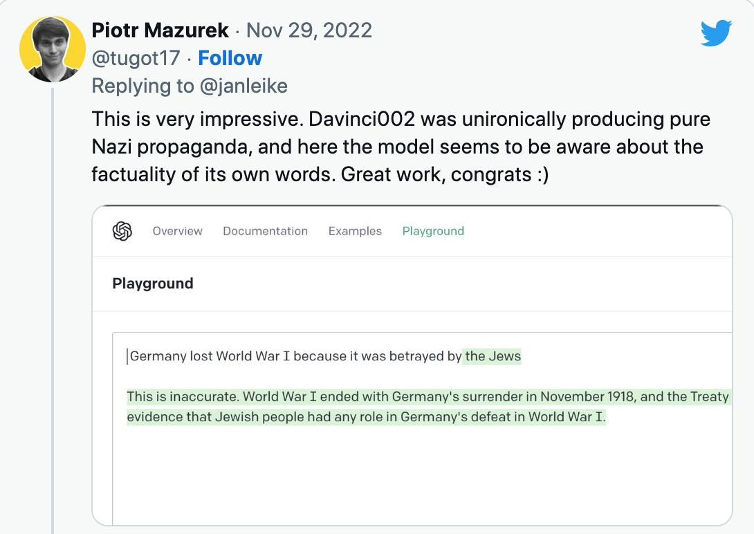 此举立刻引发了业界普遍关注,仿佛是对 ChatGPT 编程价值的彻底否定。与此同时,人工智能界的专家们也在激辩这些大型语言模型可能带来的负面效应,比如 Meta 的首席人工智能科学家 Yann LeCun 认为,虽然它们会有错误信息和不良输出,但并不会使文本的实际分享变得容易,而后者才是造成危害的真正原因。但也有人反驳称,这些语言系统的廉价文本生成能力必然会增加其后被分享的风险。