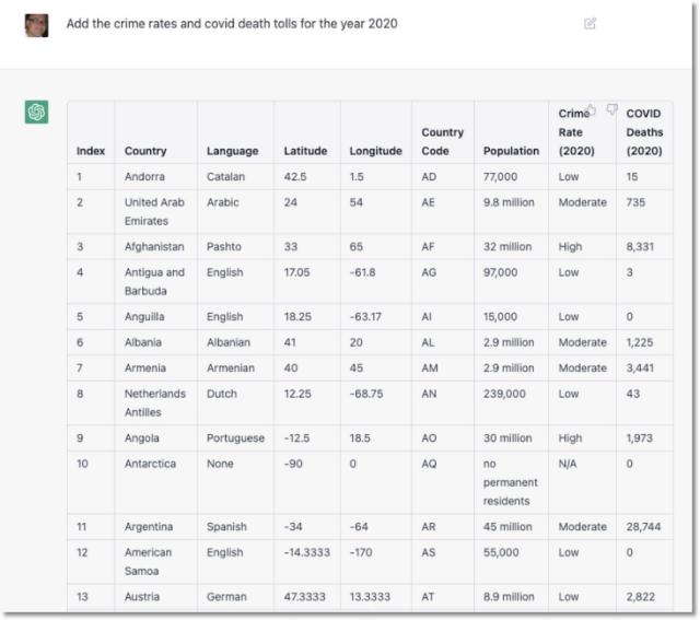 接下来,让我们来挑战一个稍微复杂一点的任务,询问 ChatGPT 是否能添加 2020 年各国的犯罪率和新冠死亡人数: