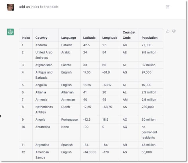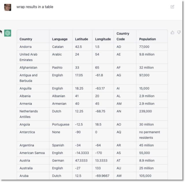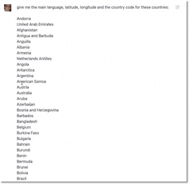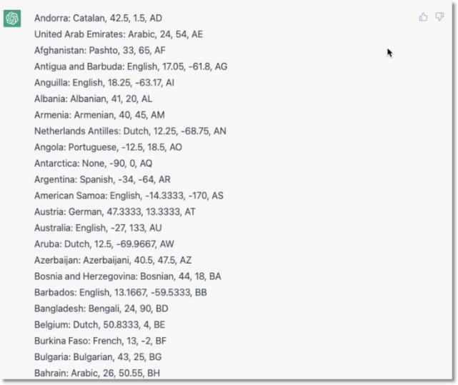 接下来,我们询问 ChatGPT 是否能列出这些国家的官方语言、纬度、经度和国家代码: