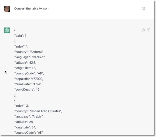 接下来,我们让 ChatGPT 将表格中的数据转换为 JSON 文件: