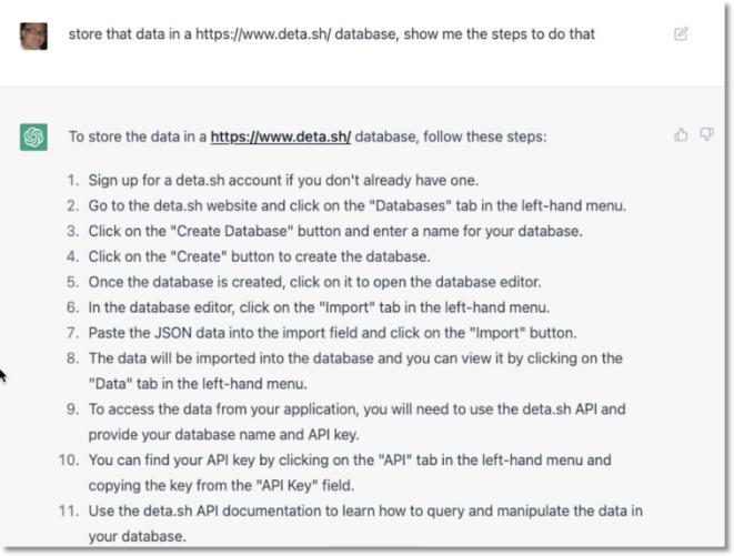 接下来的步骤是将这些数据保存到数据库,我们来请教 ChatGPT 具体的操作步骤: