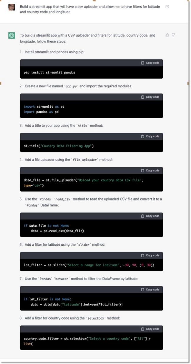 最后,我们请 ChatGPT 创建一个 CSV 上传器,并添加一些过滤条件,例如“经度”、“纬度”和“国家代码”。
