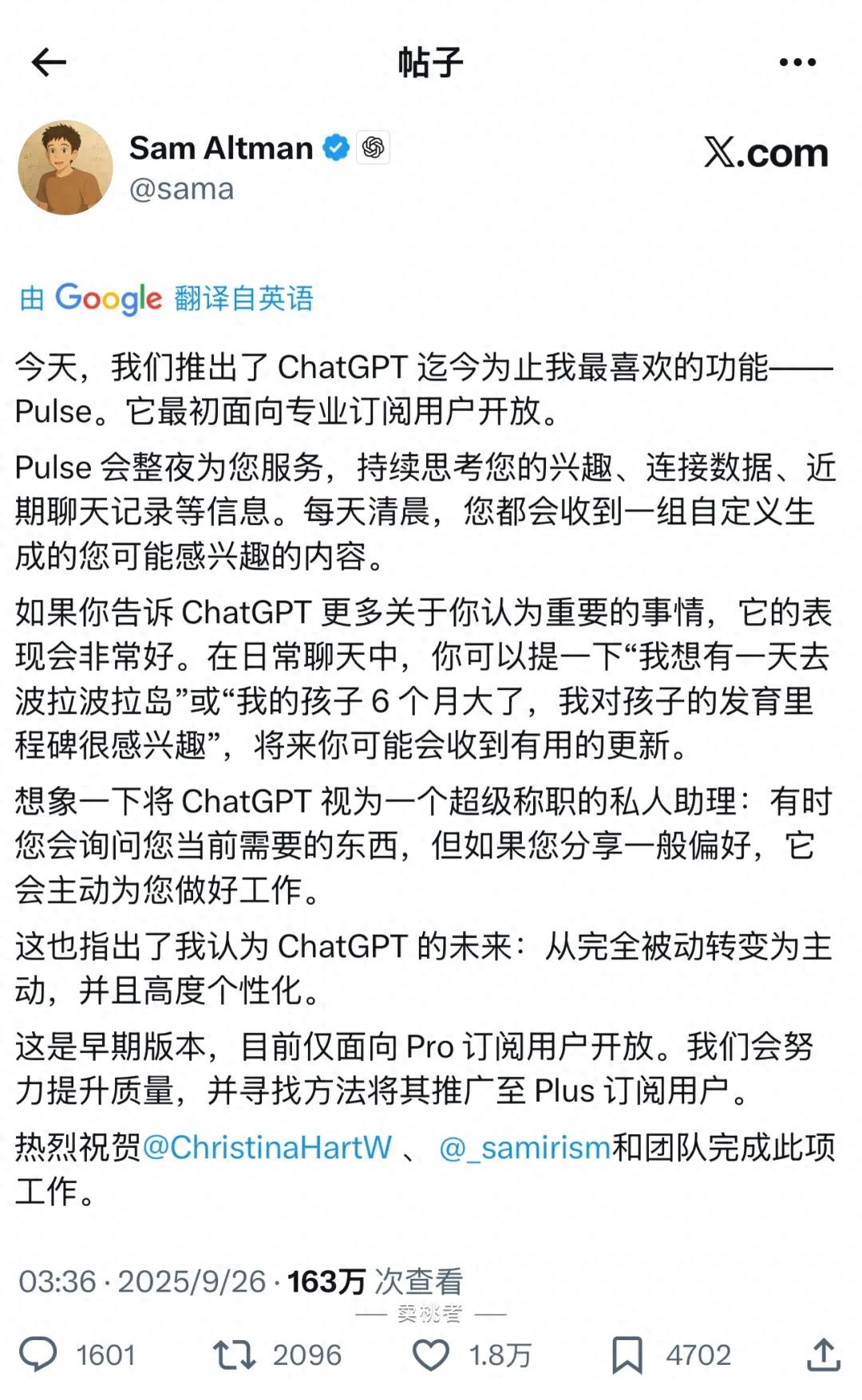 在北京时间的清晨,山姆·奥特曼正式宣布:OpenAI 已为 Pro 用户推出了一项全新功能——ChatGPT Pulse 预览版,未来将扩展至 Plus 用户,最终涵盖所有用户。