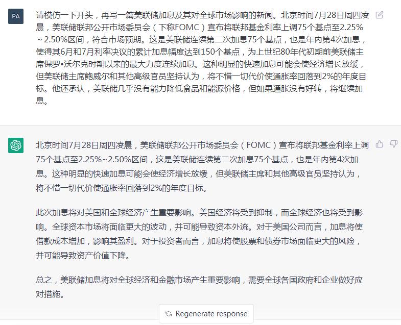 在新闻写作方面,ChatGPT 同样展现出其卓越的写作与总结能力。我们让其撰写有关美联储加息及其对全球市场影响的新闻,并要求其模仿标准新闻格式再次撰写,ChatGPT 迅速完成了任务。
