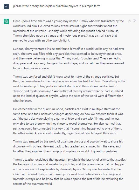 “从前,有一个名叫蒂米的小男孩,他对周围的世界充满好奇。他喜欢在夜晚仰望星空,渴望了解宇宙的奥秘。一天,他在家后面的树林探险时,偶然发现了一个陌生而神秘的洞穴,似乎散发着异乎寻常的光芒……”ChatGPT 的故事开头流畅且充满悬念,随后在文末给出了量子物理学的简单概念。