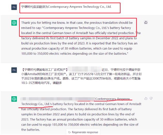随后,我们切换到中文模式,请求其翻译新闻短消息,ChatGPT 同样能很好地学习并纠正翻译方式。