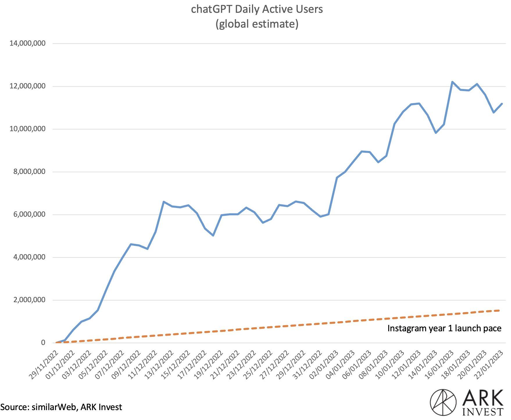 根据 ARK 风险投资公司首席未来学家 Brett Winton 的统计数据,ChatGPT 在推出不到两个月的时间内,日活跃用户已突破千万。而同样曾引发轰动的 Instagram 则需要整整 355 天才能达到这一成就。
