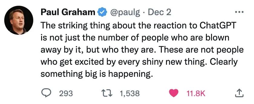 “ChatGPT 令人惊叹之处在于,不在于有多少人被它震撼,而在于震撼到的是谁,这些人不会随便对每一个新事物感到兴奋,显然,重大事件正在发生。”