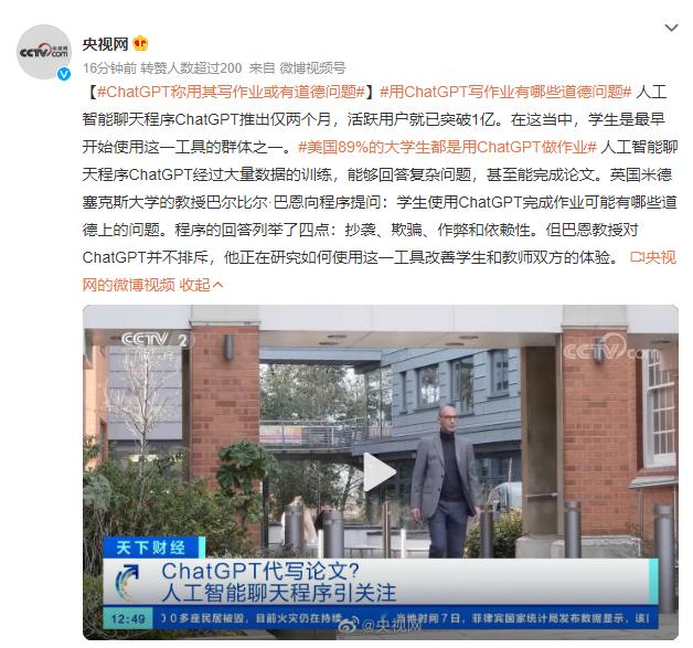 学生是最早开始使用这一工具的群体之一。美国 89% 的大学生都是用 ChatGPT 做作业,人工智能聊天程序 ChatGPT 经过大量数据的训练,能够回答复杂问题,甚至能完成论文。