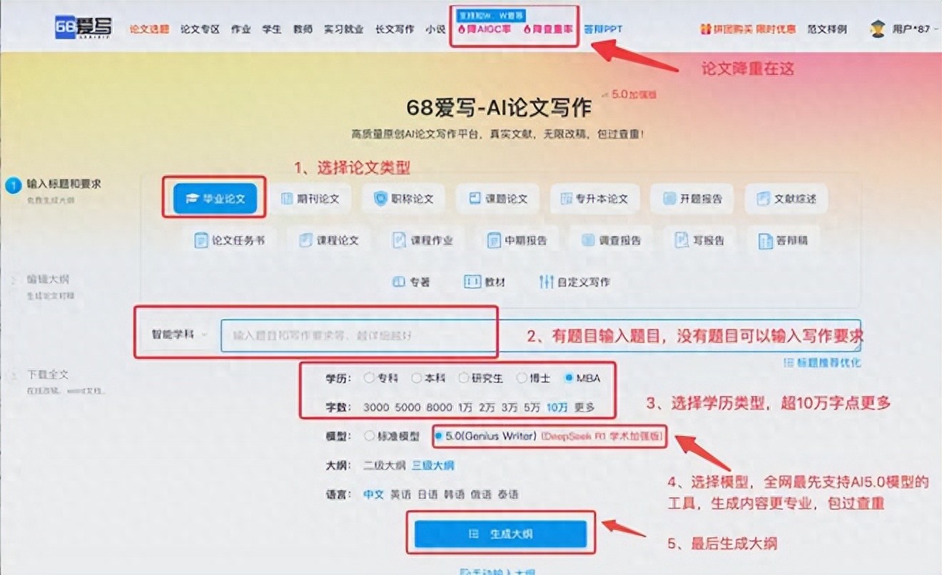 1、采用 AI5.0 技术,提升 AI 论文生成质量: