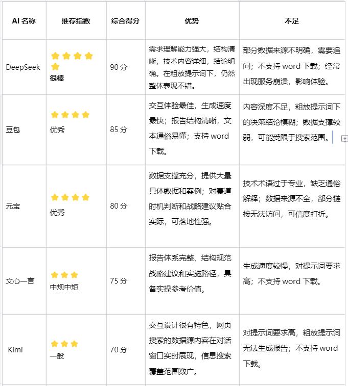 - 不足: 内容深度不足,粗放提示词下的决策结论模糊,缺乏商业模式的内容;数据支撑较弱,可能受到搜索范围的限制。