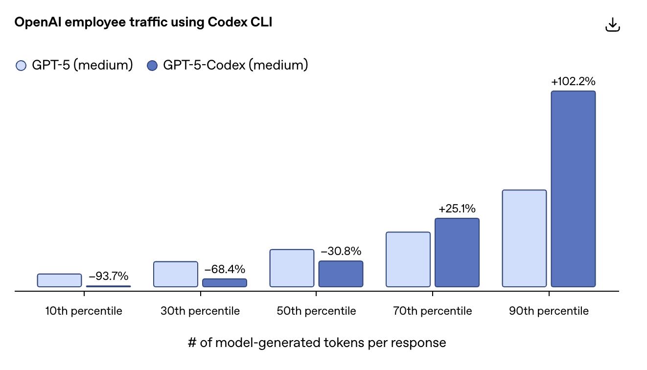 OpenAI 内部员工使用数据显示,按模型生成的 token 数排序,对于最底部 10% 的简单请求,GPT-5-Codex 比 GPT-5 少用了 93.7% 的计算资源。