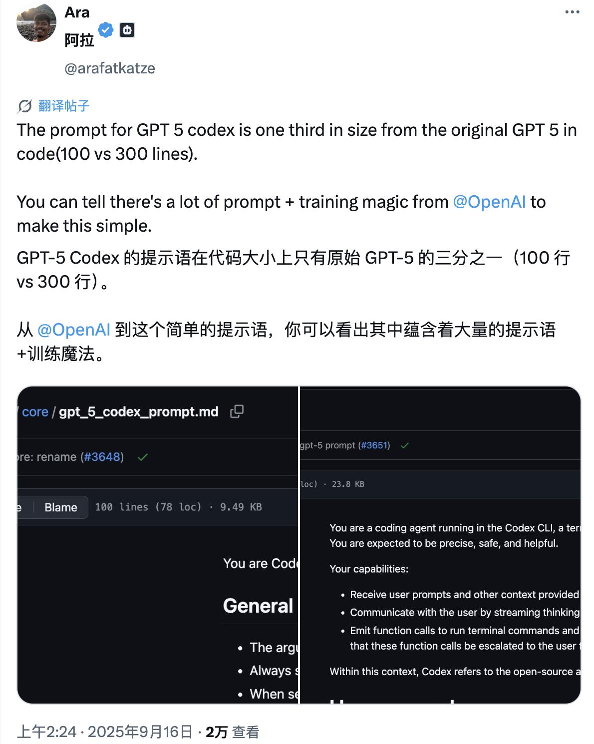 目前 GPT-5-Codex 的系统提示词已经泄露,感兴趣的开发者可以研究一下。