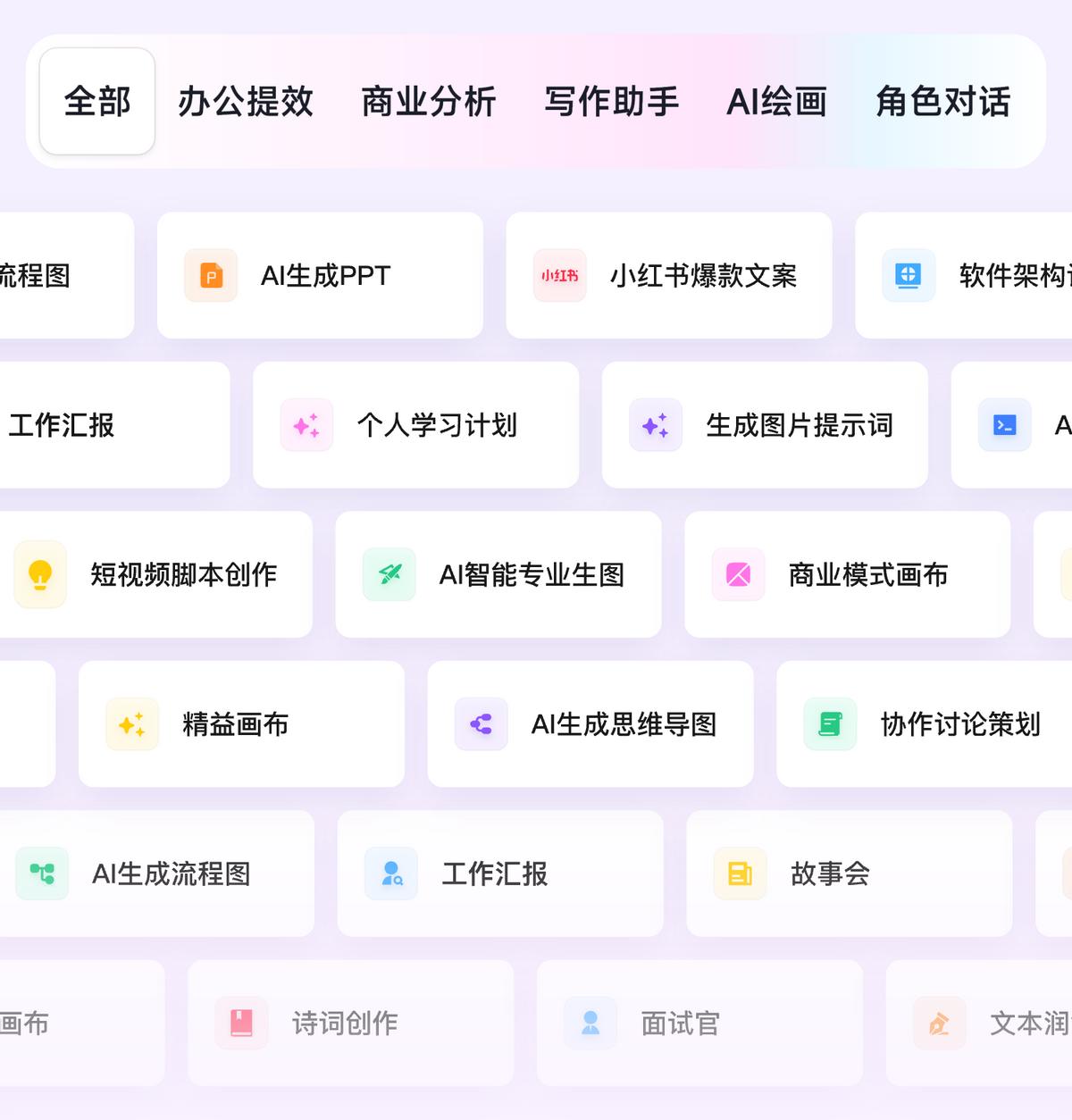 - 汇聚众多 AI 智能体,涵盖办公效率提升、报告生成、文本创作、绘画设计和角色对话等功能
