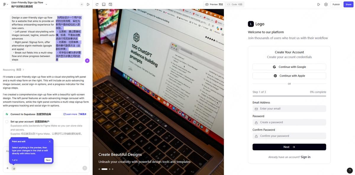 Figma AI 是由在线设计工具 Figma 推出的一款 AI 工具,最常见的应用场景是快速生成 UI 设计稿,将创意迅速实现。Figma AI 的操作极其简单,用户只需在左侧输入框中输入如“为网站设计一个用户友好的注册流程,提供轻松的产品使用体验”的描述,便能通过 AI 的理解和分析,快速生成具备交互能力的 UI 设计稿。