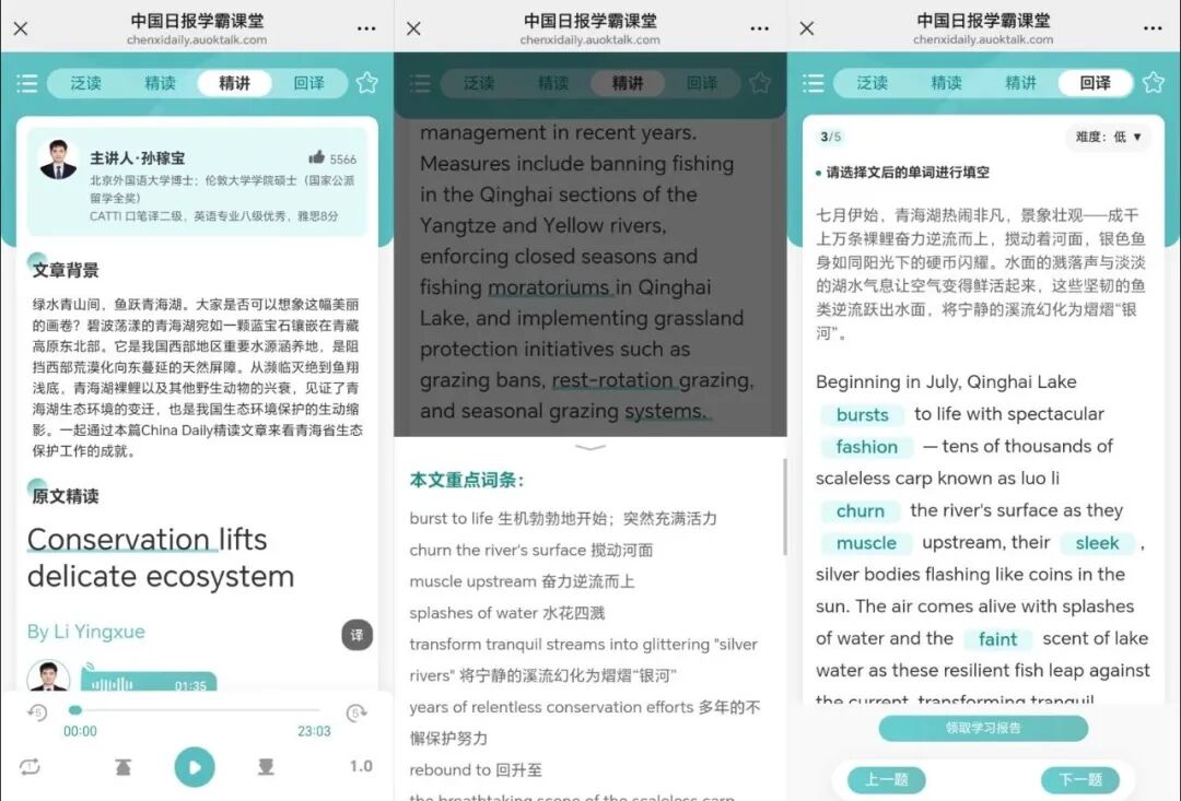 China Daily 精读计划中的每篇文章均选自中国日报,涵盖深度新闻报道,内容涉及中国传统文化,如西夏陵申遗、江南园林;社会前沿趋势,如 DeepSeek、AI 机器人、“谷子”经济;还有各类国际重大事件,如李在明当选、特朗普“对等关税”、俄乌冲突等。