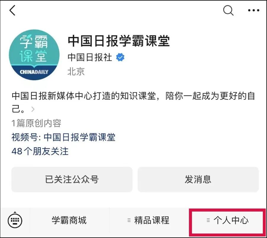 付款后,请关注 “中国日报学霸课堂” 公众号,点击右下角“个人中心—精读会员”。