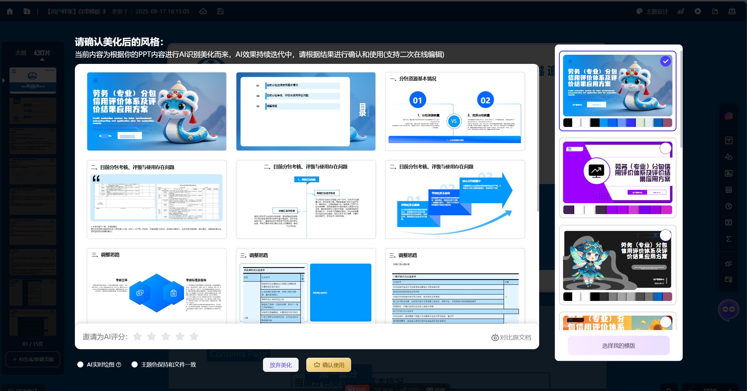 - 在上传已有 PPT 文件后,ChatPPT 能够迅速解析内容结构,并推荐多种适合的美化风格。在测试中,ChatPPT 在 5- 7 秒 内完成了 20 页 PPT 的初步解析,并提供了多种美化风格,同时支持 hover 预览。