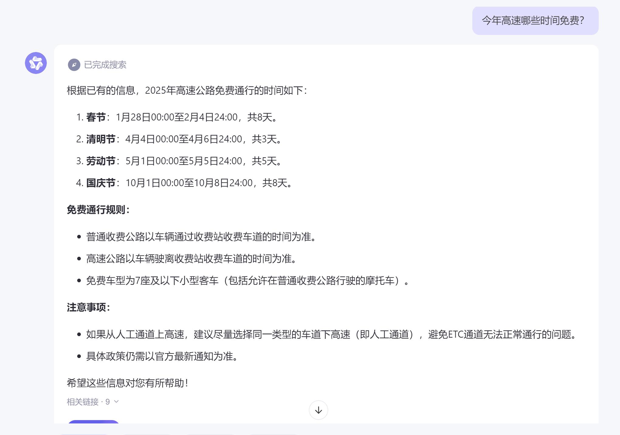 早就计划好假期出行的小雷,向 AI 提出的第一个问题是“今年高速公路哪些时间免费”。通义千问没有提供所有高速公路的免费时间段,只告知了春节期间的起止时间。小雷不甘心,问了两次,得到的答案完全相同。而文心一言则统计出了春节、清明、劳动节和国庆四个节假日的高速免费开始和结束时间,并附上了免费通行的车辆标准。