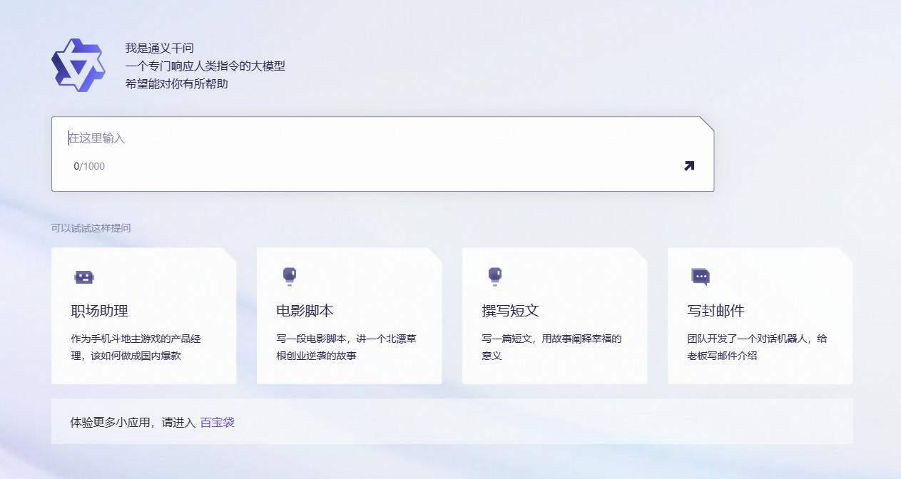 贝壳财经记者登录通义千问发现,其首页写有“我是通义千问 一个专门响应人类指令的大模型 希望能对您有所帮助”的介绍语,页面中心是一个简洁的输入框,可输入不超过 1000 字内容。同时,其还在页面下方给出了“职场助理”“电影脚本”“撰写短文”“写封邮件”四个提示提问问题。