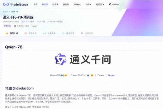 在 8 月 3 日,阿里云正式发布了其开源的通义千问 70 亿参数模型,其中包括通用模型 Qwen-7B 和对话模型 Qwen-7B-Chat。这两款模型已在魔搭社区上线,完全免费且可供商业使用。阿里云因此成为国内首个进入大模型开源领域的大型科技企业。