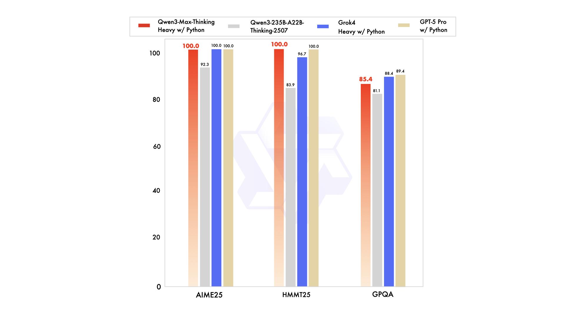作为推理增强的版本,Qwen3-Max-Thinking 尽管仍在训练阶段,但已经展现出惊人的潜力。该版本通过集成代码解析器,运用并行测试计算技术,展示了卓越的推理能力。在复杂的数学推理基准测试中,比如 AIME 25 和 HMMT,Qwen3-Max-Thinking 均获得了满分,充分表明其在复杂逻辑推理方面的突出表现。