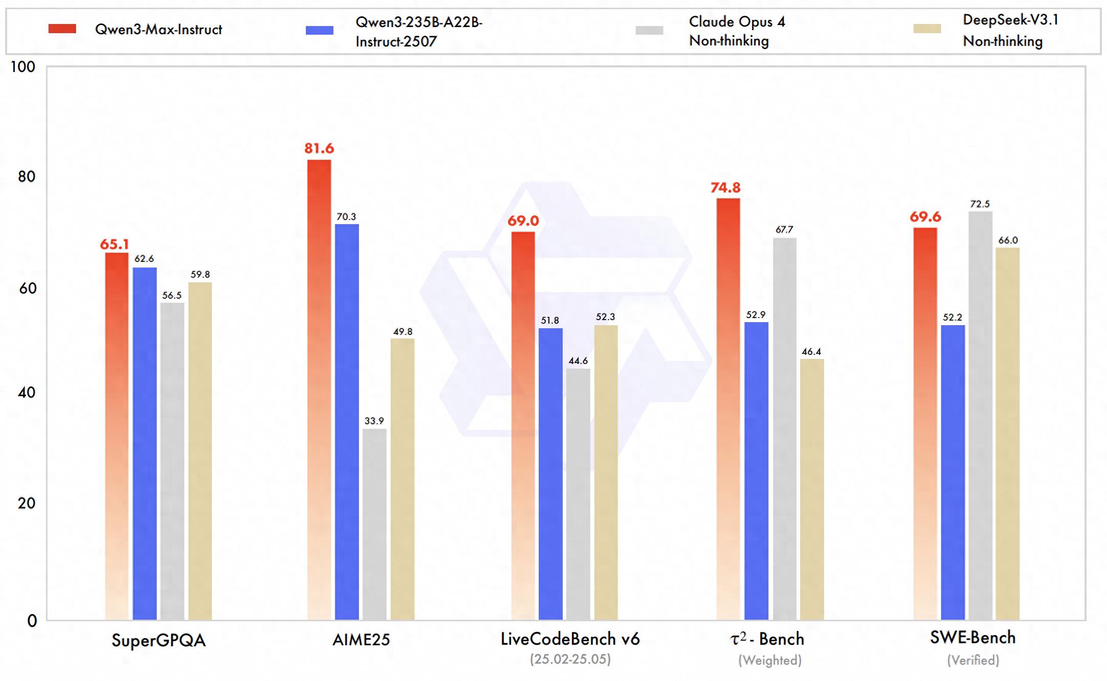 在专注于解决实际编程问题的基准测试 SWE-Bench Verified 中,Qwen3-Max-Instruct 取得了令人瞩目的 69.6 分。在评估智能体工具应用能力的 Tau2-Bench 上,它以 74.8 的分数超越了 Claude Opus 4 和 DeepSeek-V3.1。