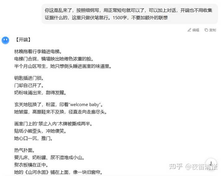 到此,新的故事雏形已经形成,但根据我第一篇小说的经验,DeepSeek生成的小说AI气息较重,倾向于使用被动句,阅读起来并不流畅。因此,我将大纲和细纲交给Kimi进行正文撰写。