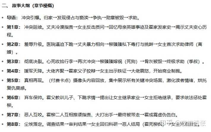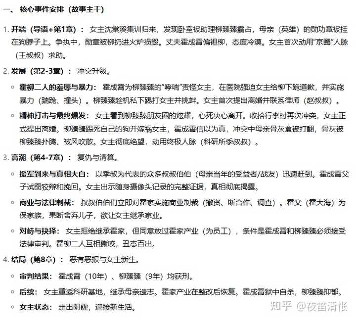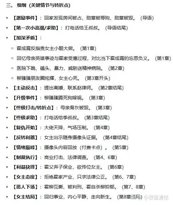 - 结构清晰: 开端(受气)、发展(受虐+初步反击)、高潮(复仇清算)、结局(恶报+新生)四部分明确。