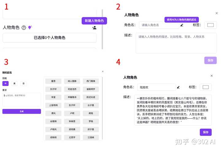 - 在角色菜单中,您可以创建一个主角,这里提供了一些 AI 生成的角色名称供您选择。