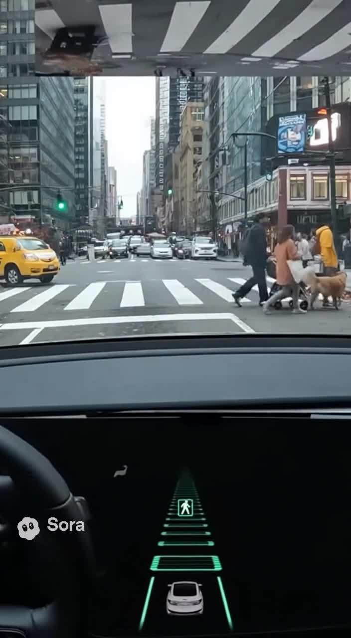 通过摄像头展示的一辆自动驾驶汽车,从正面视角驶过繁忙的城市十字路口,周围有行人、狗和婴儿车经过,还有外卖小哥匆忙而过,旁边的人们在尖叫。