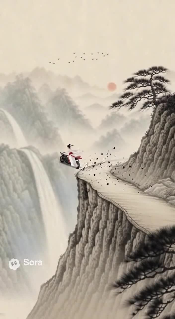 在中国山水的背景下,骑摩托车的场景同样可以实现: