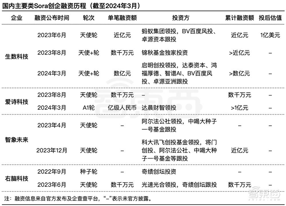 根据公开的融资数据,生数科技是目前国内 融资总额与估值最高 的类 Sora 公司。